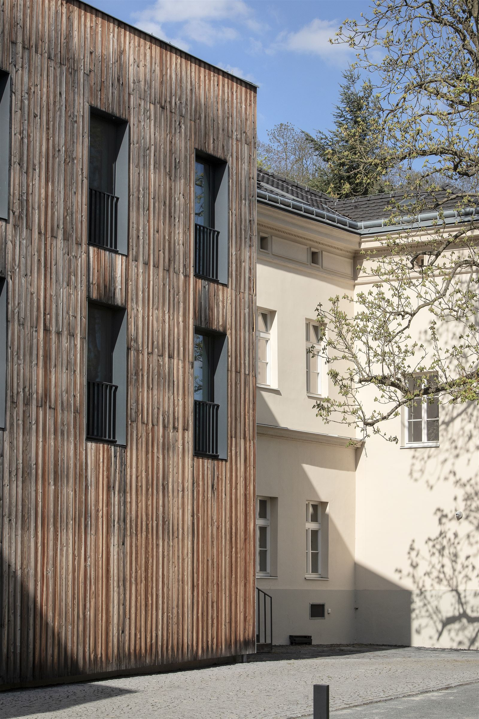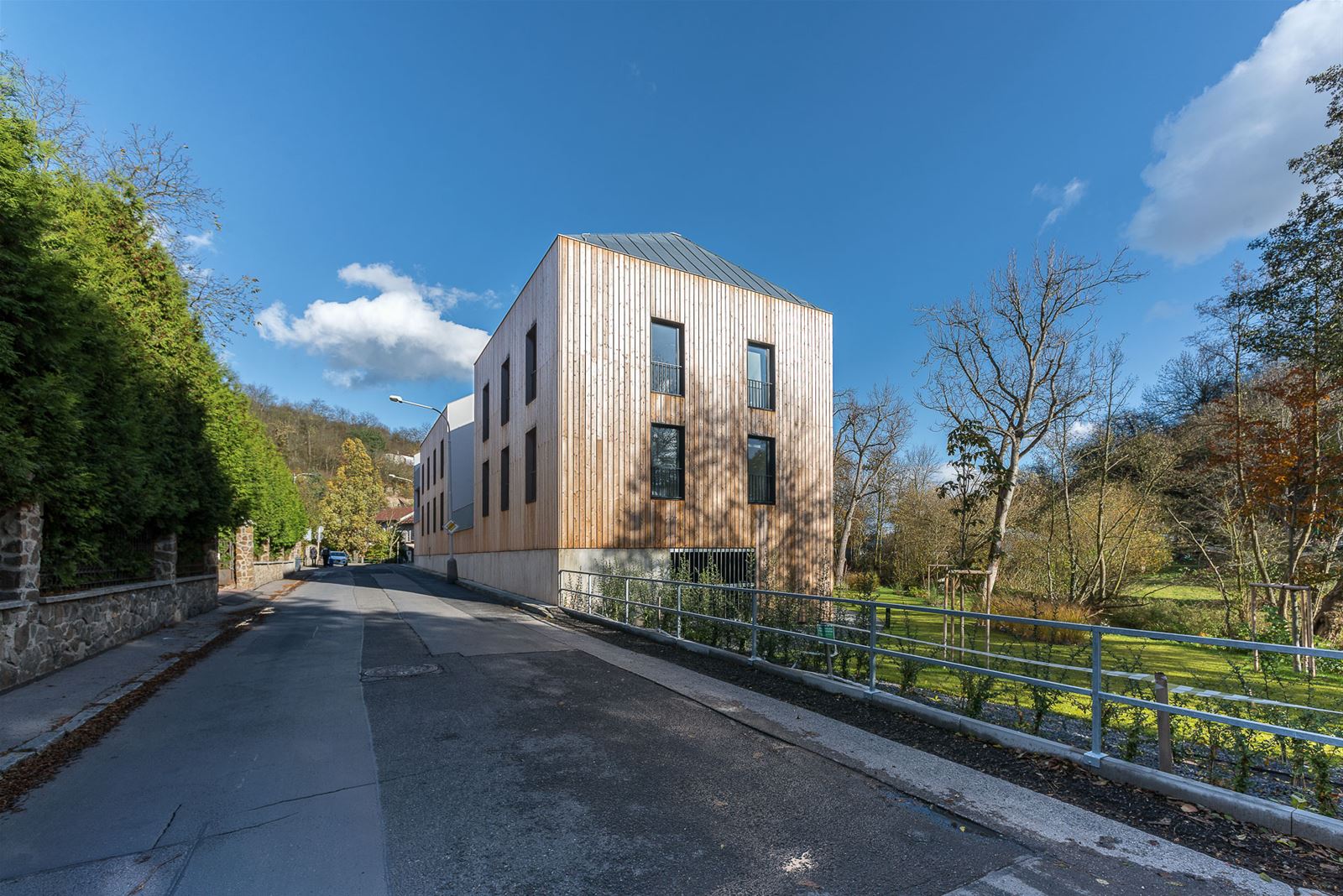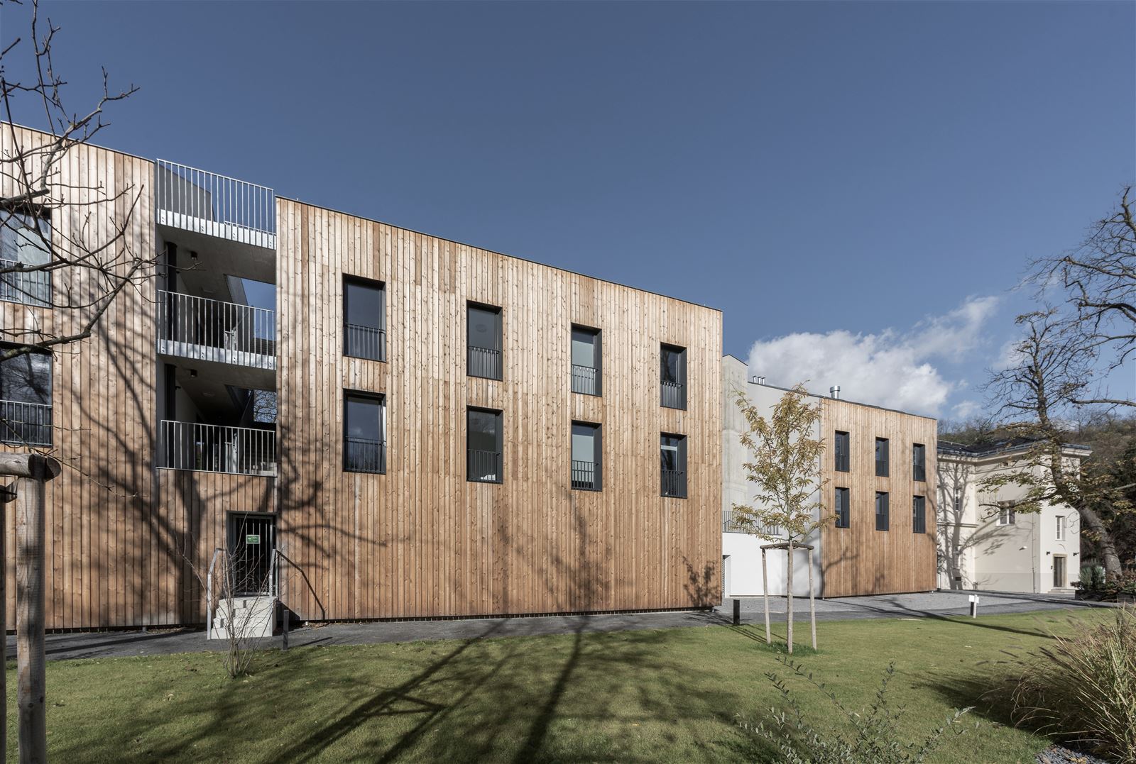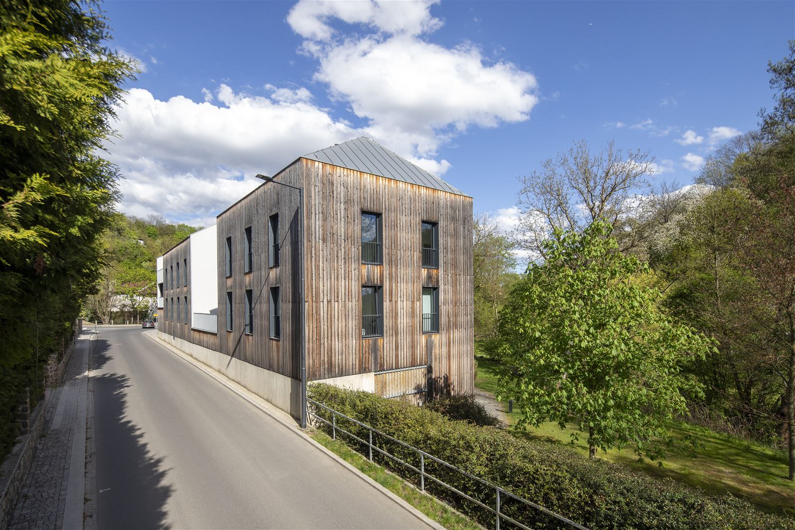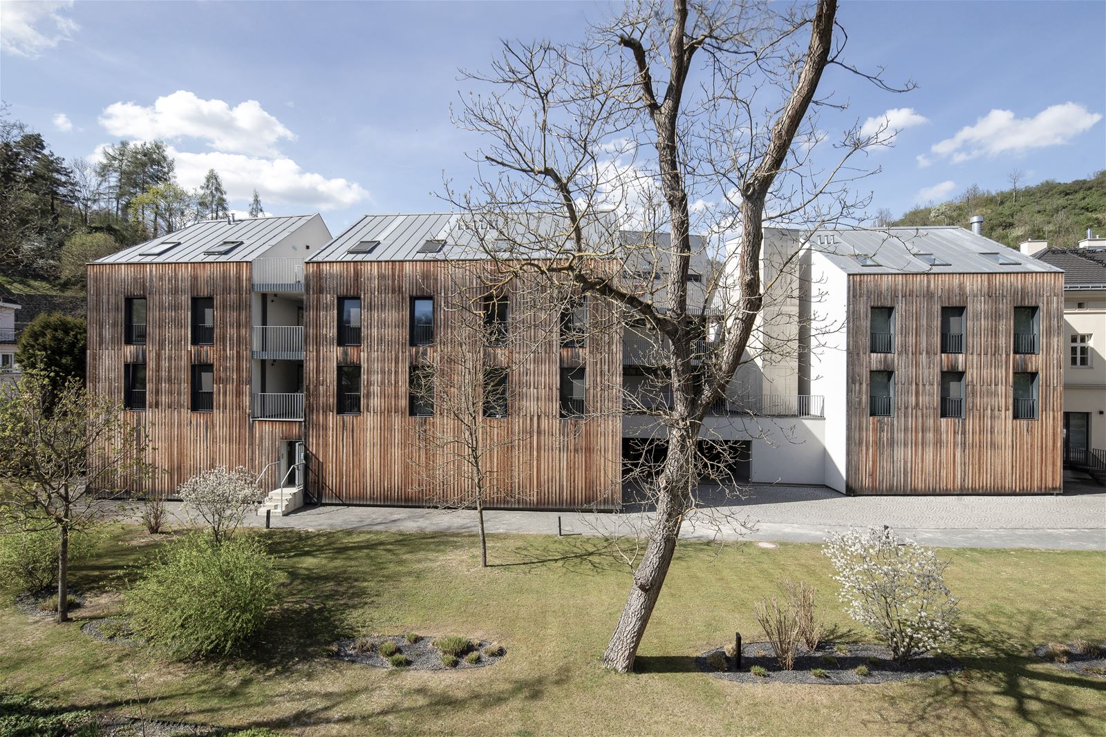 Jednotlivé objekty jsou z vnější části obloženy modřínovým dřevem, vnitřní fasády, v souladu s konceptem “rozřezaných hmot", se typem a vzhledem omítky odlišují.