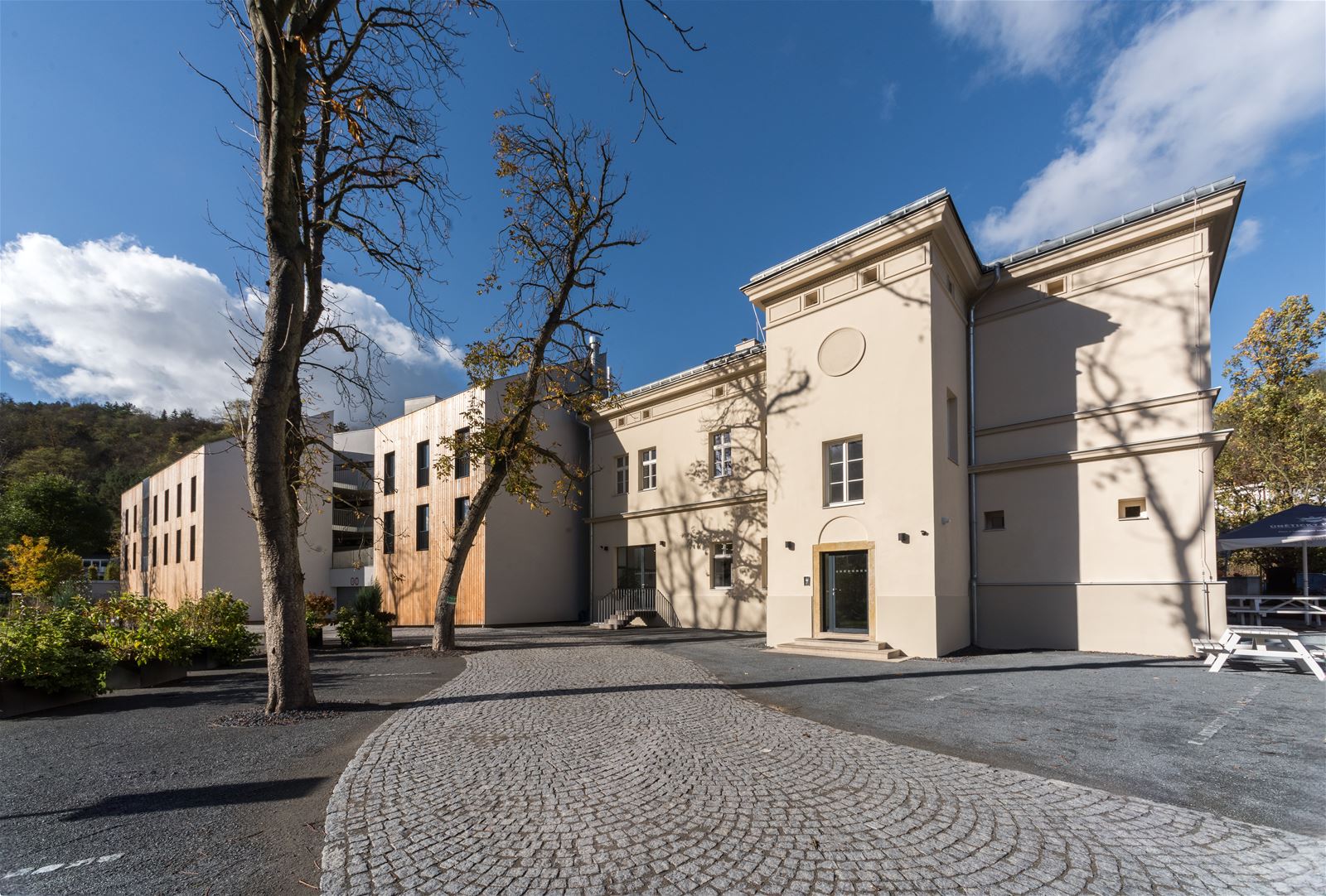 Dřevěný obklad volně navazuje na charakter místa. Volba tohoto materiálů přenechala dominantní postavení bývalému hostinci a zachovává jeho jedinečnost. Ten byl očištěn od přístaveb a díky stále existující dobové dokumentaci mu byla kompletně navrácena původní štuková výzdoba.