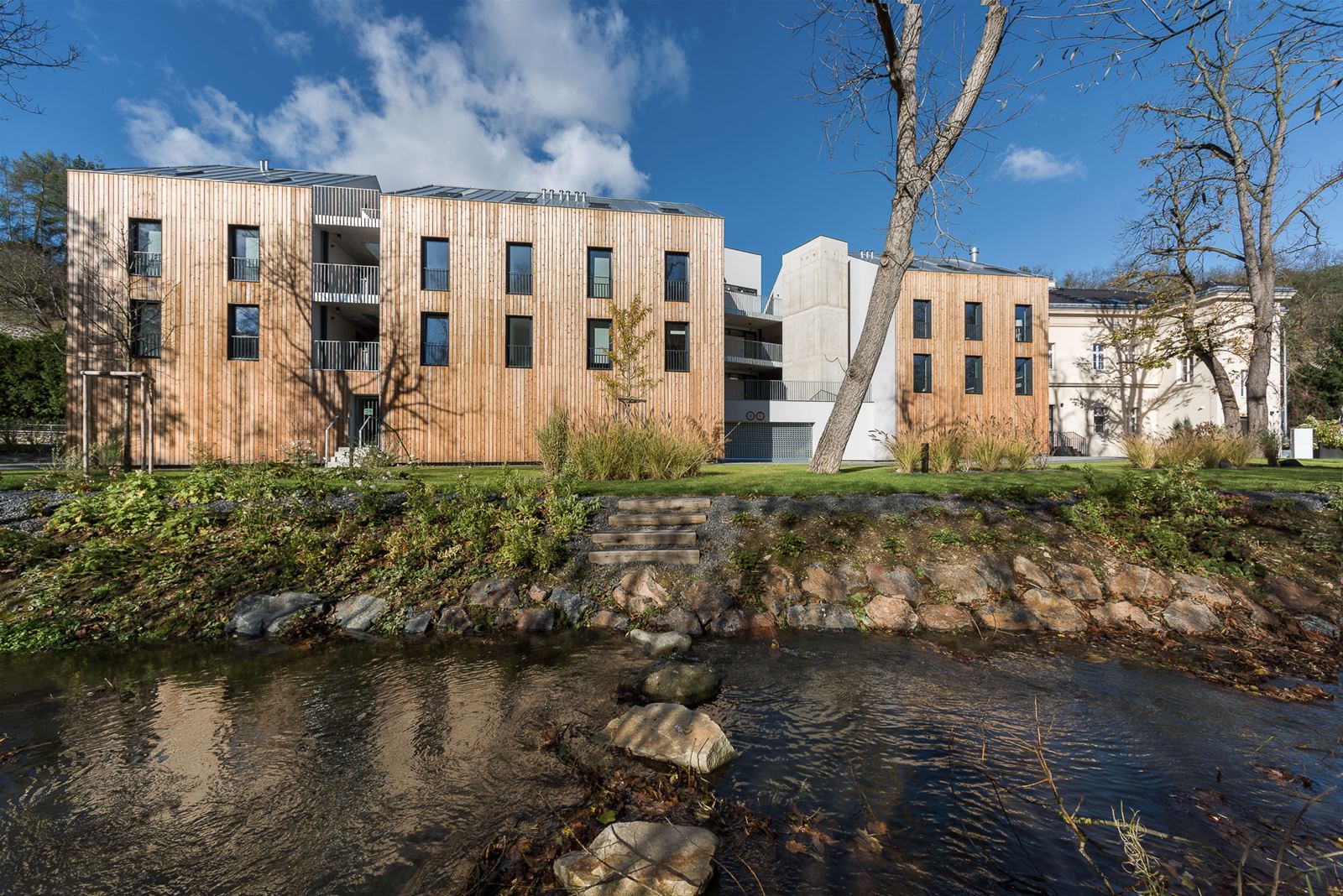 Novostavby stojí na podnoži garáží. Celý areál leží v záplavovém území, a proto muselo být první nadzemní podlaží umístěno minimálně 1 metr nad nejvyšší zaznamenanou úrovní povodně.