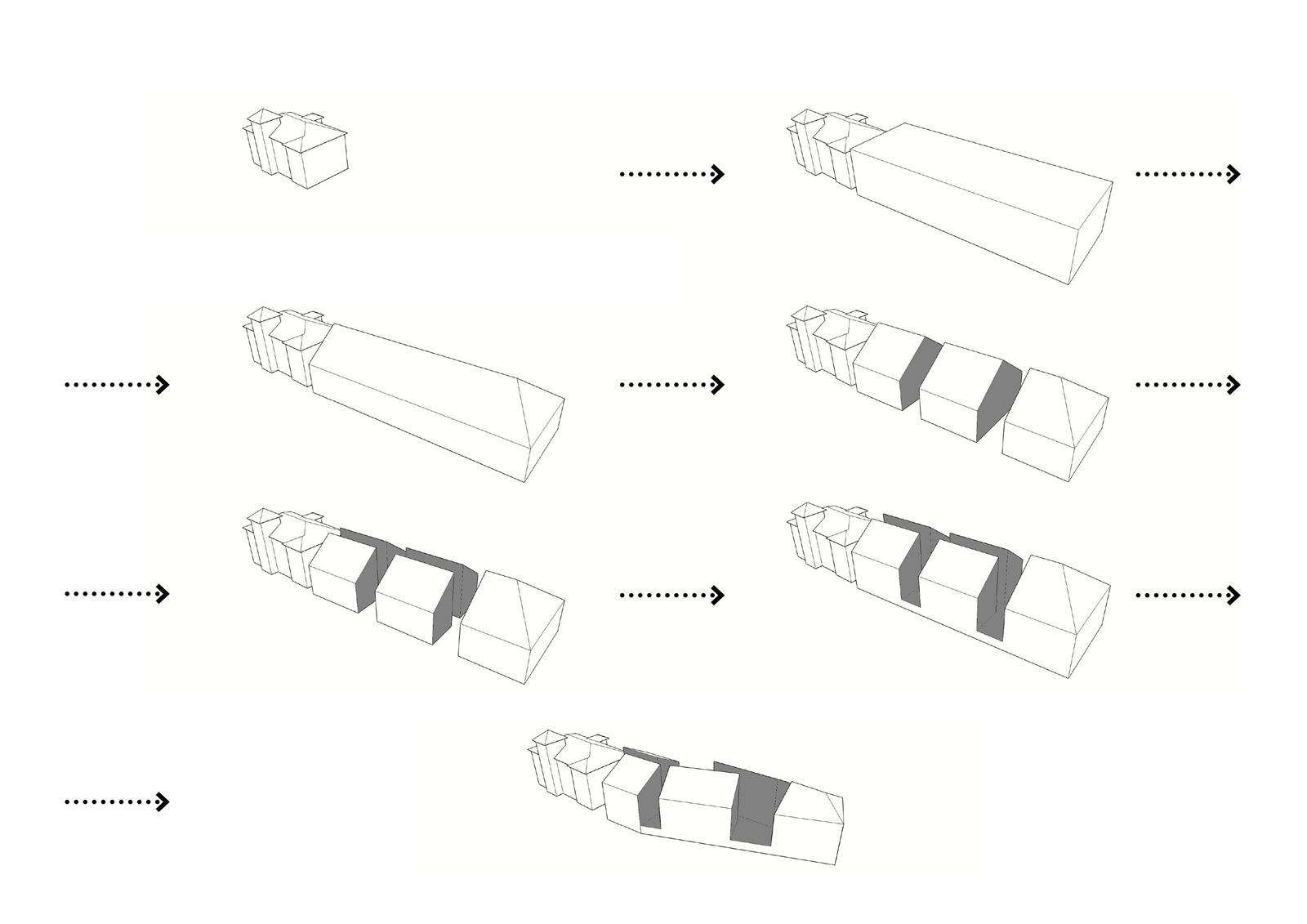 Návrh vycházel z přesné katastrální stopy sokolovny a přilehlých staveb. Požadovaný objem působil v kontextu místa i sousední historické budovy příliš robustně, proto vznikl koncept „rozlámání“ klasické hmoty do menších celků jednotlivých domů, s tradiční sedlovou střechou, propojených pavlačí. Stopa původních staveb byla dodržena.