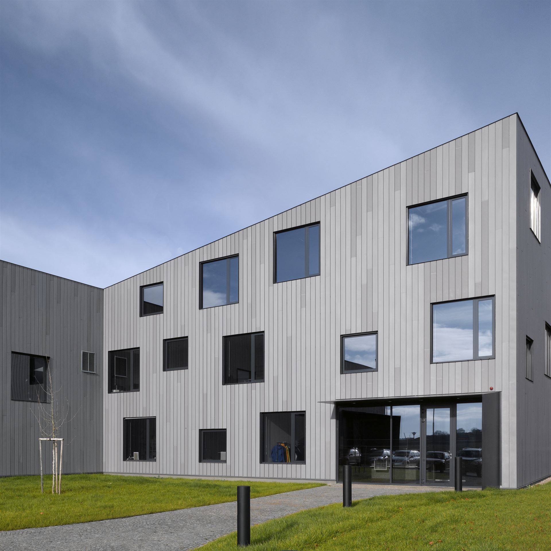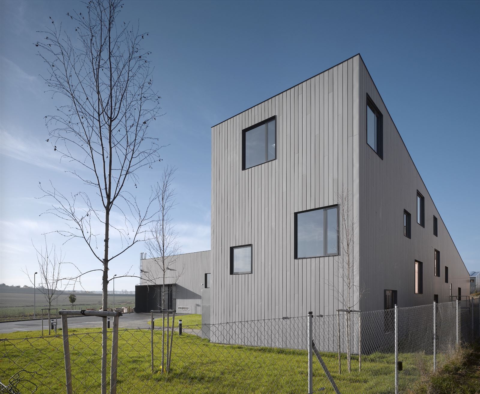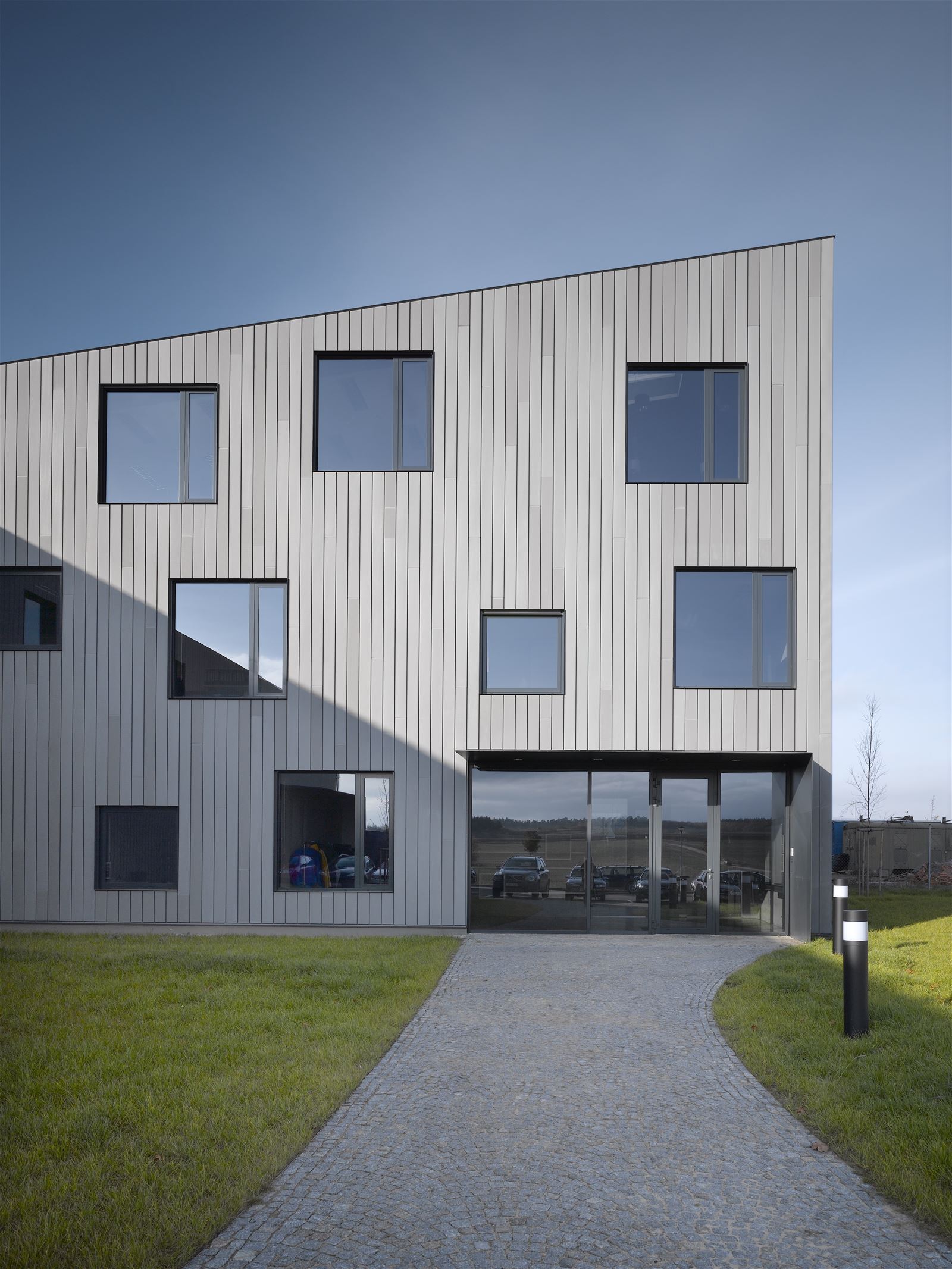 Vnější vzhled stavby je utvářen pláštěm z vertikálně orientovaných lamel z předzvětralého zinkového plechu o modulu 200 mm. Pruhovanost fasády nebyla uměleckým záměrem, ale důsledkem dodávky nestejných šarží plechů francouzským výrobcem. Čtvercová okna dvou velikostí jsou po fasádě rozmístěna podle potřeby. Ocelové zámečnické prvky, především lemy oken a vstupní pergoly, které jsou opatřeny práškovým vypalovaným lakem v barvě antracitu. Střešní krytina je na obou částech totožná z titanzinkového trapézového plechu s volně rozmístěnými světlíky.