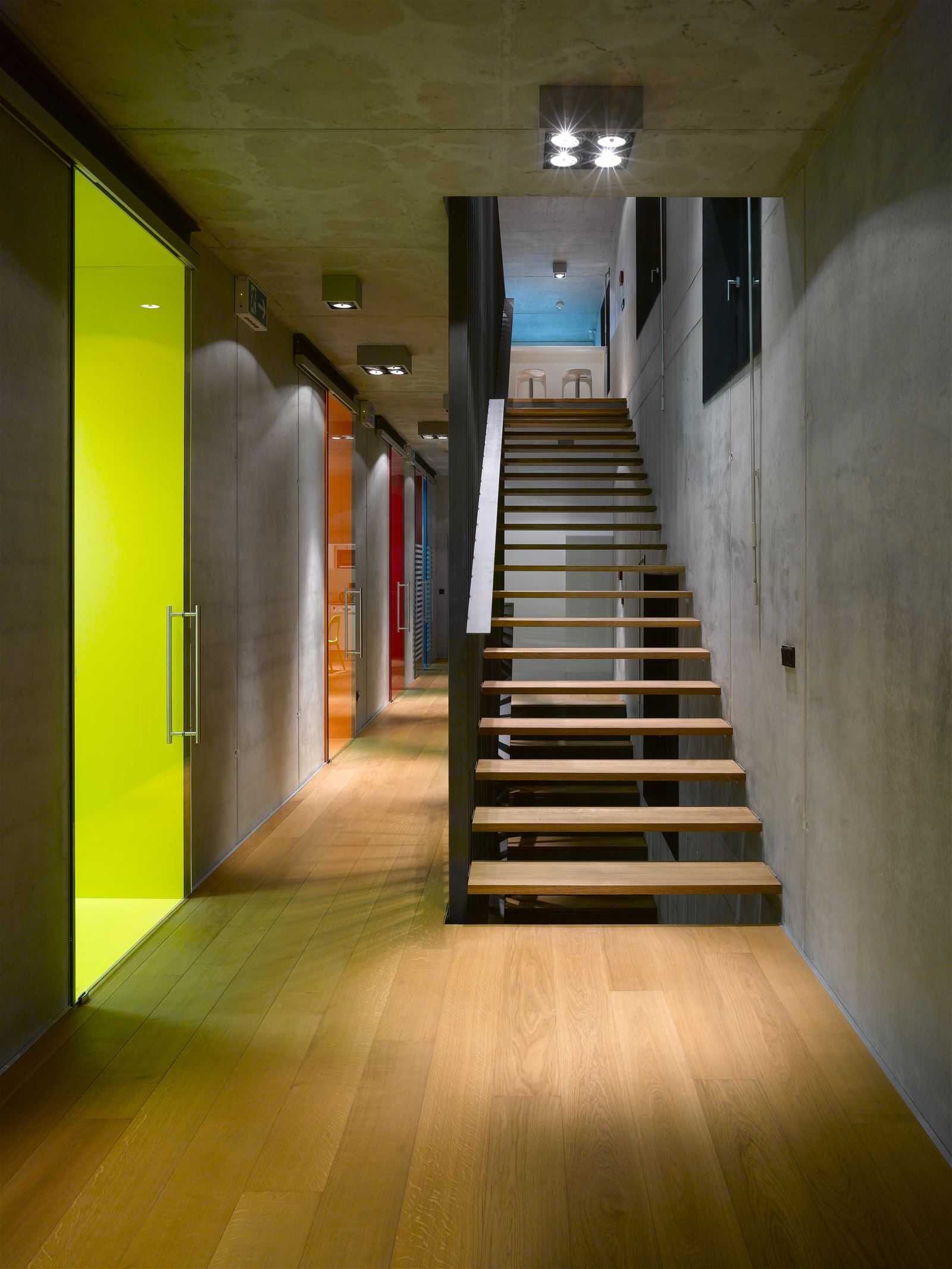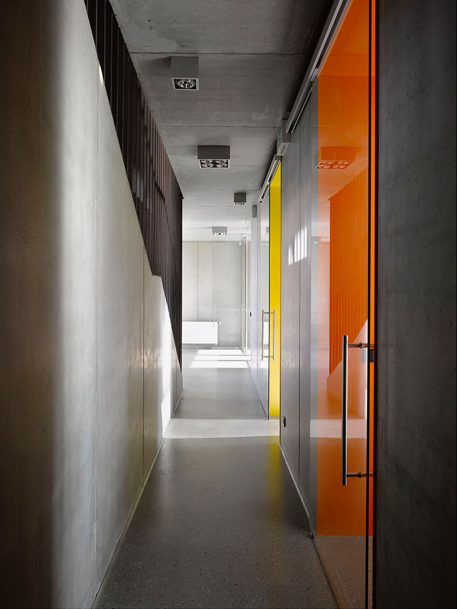 Interiéry využívají na stropech a stěnách pohledový beton, který místy zakrývá pouze na míru vyrobený převážně vestavěný nábytek. Podlahy v patrech pokrývají dřevěné lamely, v přízemí pak tmavší broušené terazzo.