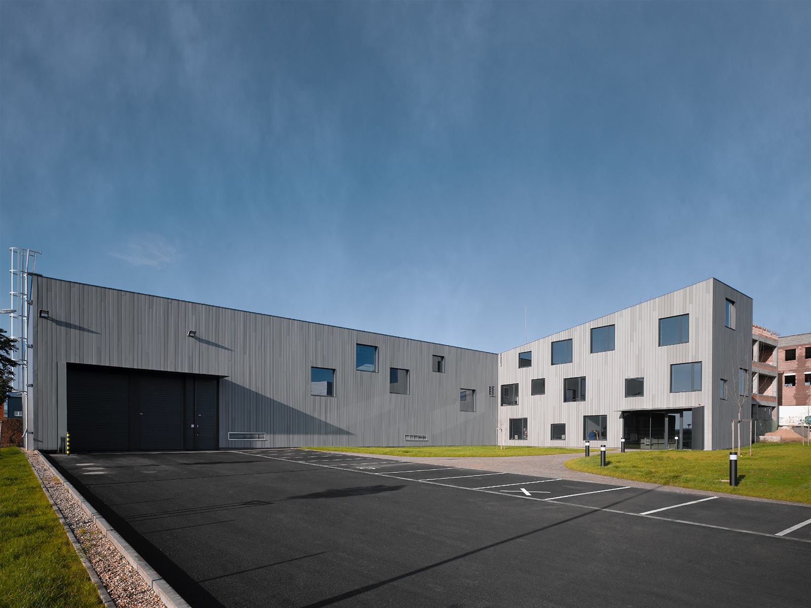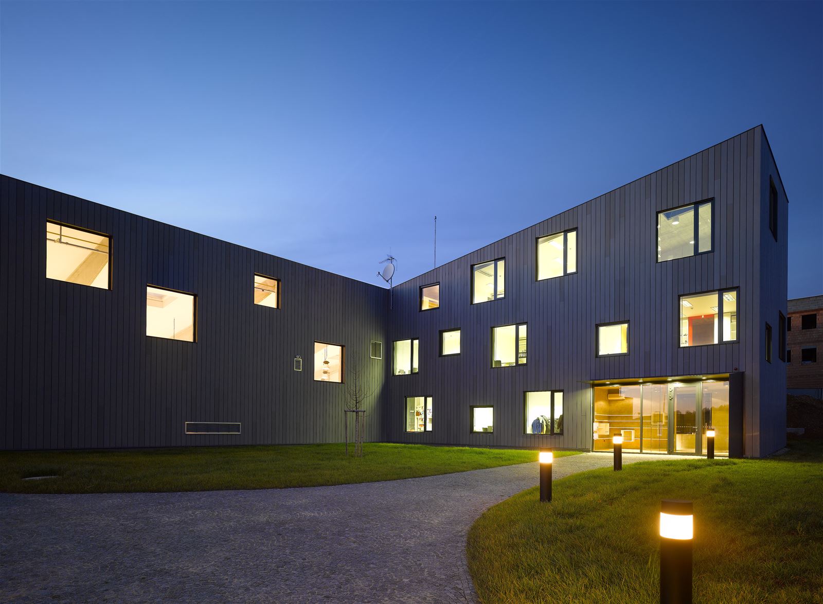 Areál firmy Dermatex stojí na okraji průmyslové zóny v Jesenici u Prahy. Investor, výrobce obuvi a volnočasové módy, nás oslovil s požadavkem na návrh administrativně-provozní budovy, která centrální distribuční sklad propojí s prostorem pro kanceláře zaměstnanců a vedení společnosti. Zadavatel očekával reprezentativní, domácí a osobité sídlo firmy s příjemným pracovním prostředím a důrazem položeným na detail. Vytvořili jsme kompaktní, uzavřený celek, který se od průmyslového okolí odvrací a cílí pozornost směrem dovnitř, k sobě samému a k lidem, kteří v něm pracují.