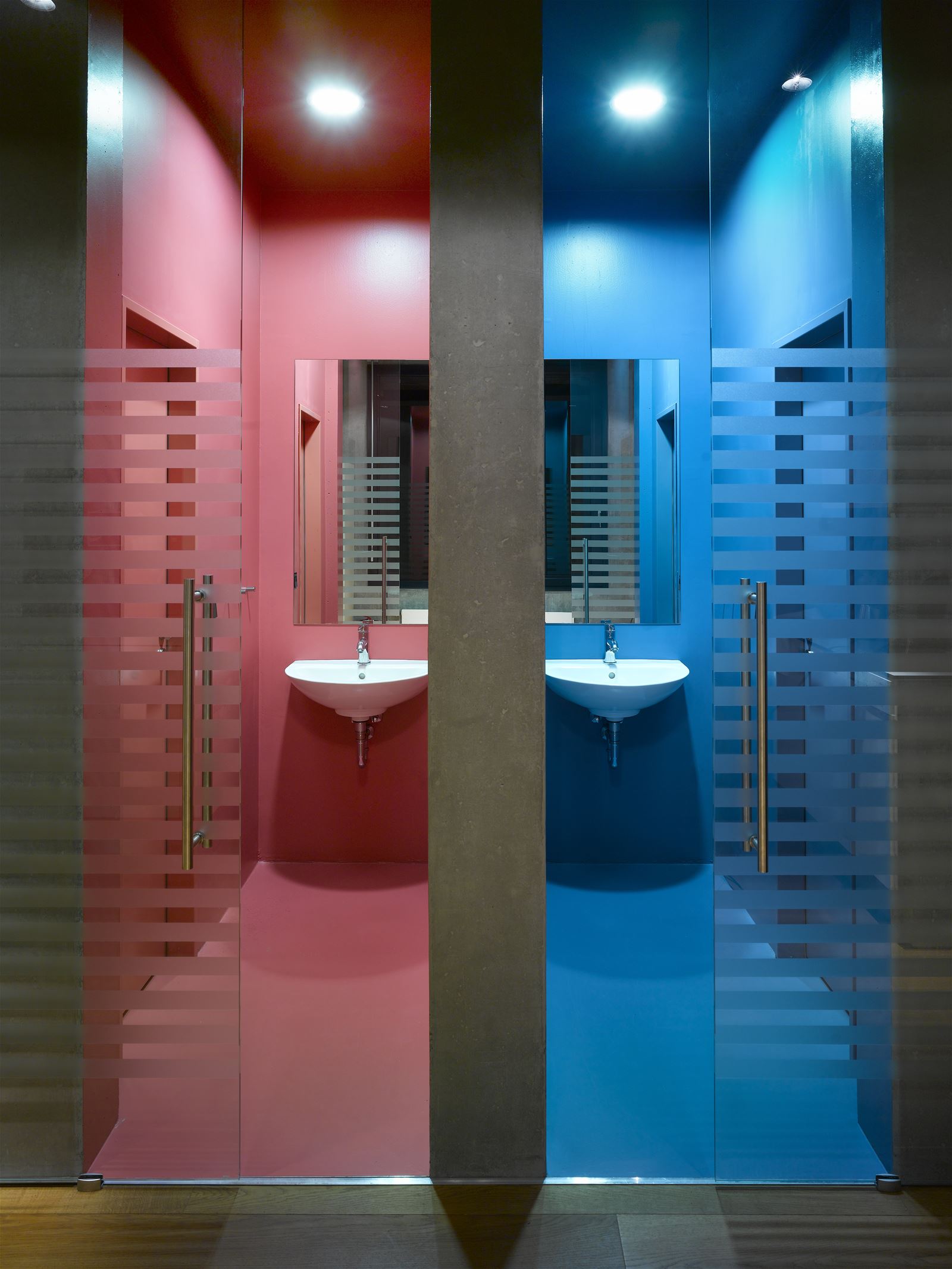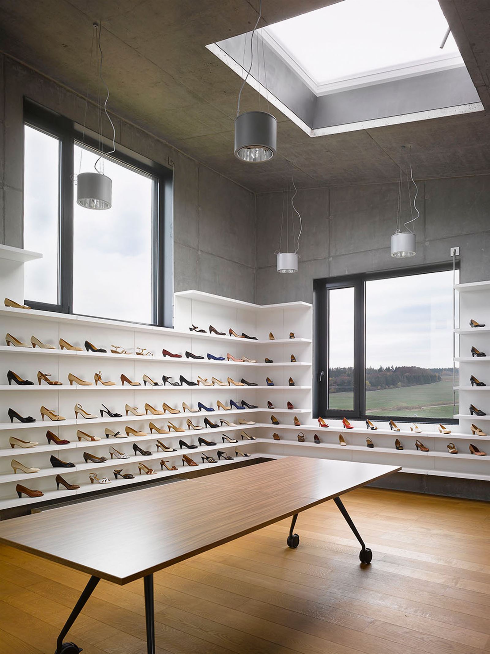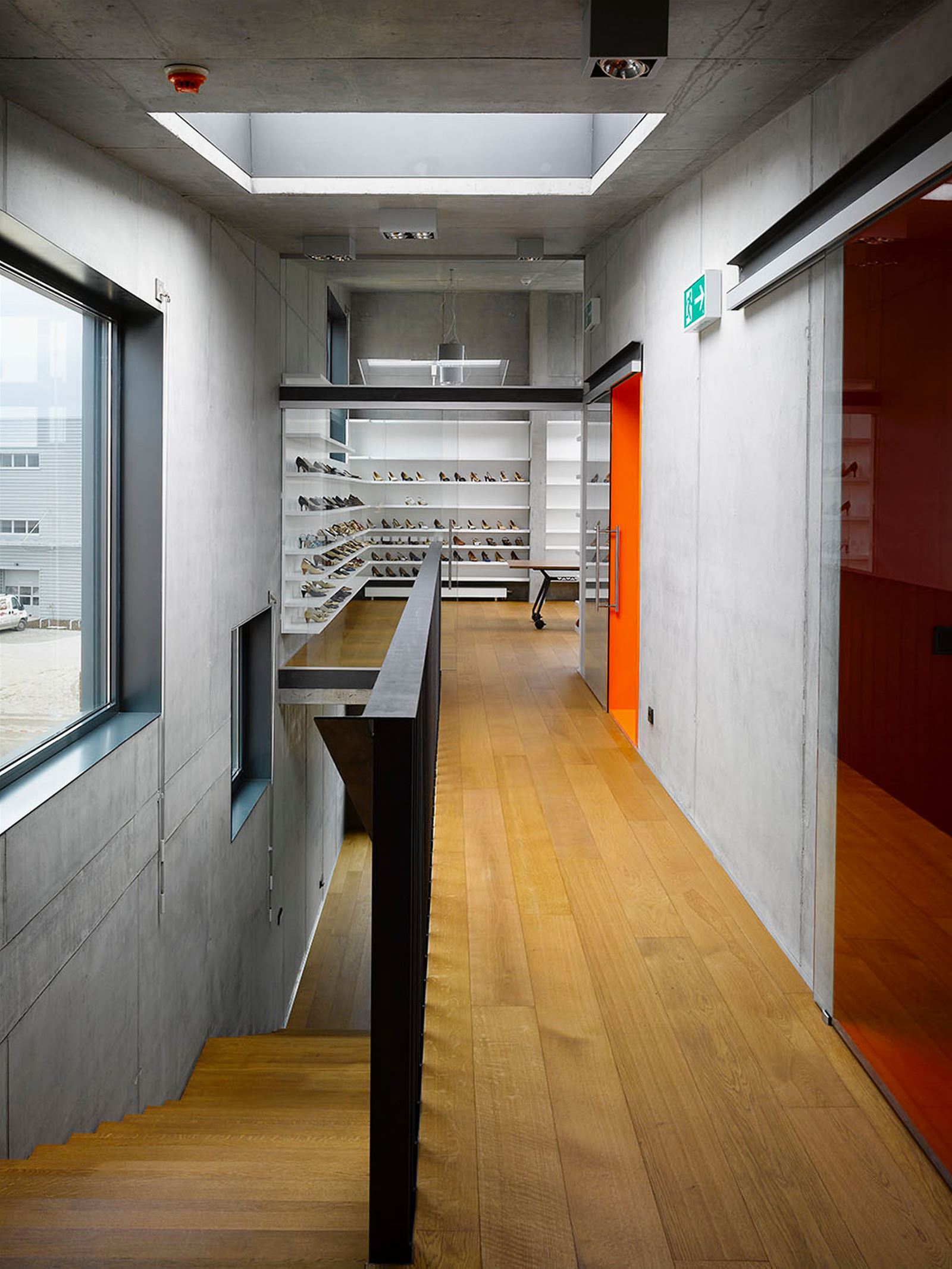 Povrchy v sociálních zařízeních jsou upraveny polyuretanovými stěrkami a nátěry v různých barvách. V přízemí administrativní budovy se nachází prodejna, zázemí zaměstnanců a kanceláře. Stejně tak horní patra slouží jako běžná kancelářská pracoviště. Nejdůležitější místnost, vzorkovna obuvi se stěnami lemovanými policemi, je umístěna ve třetím patře a oslněna přirozeným horním světlem.