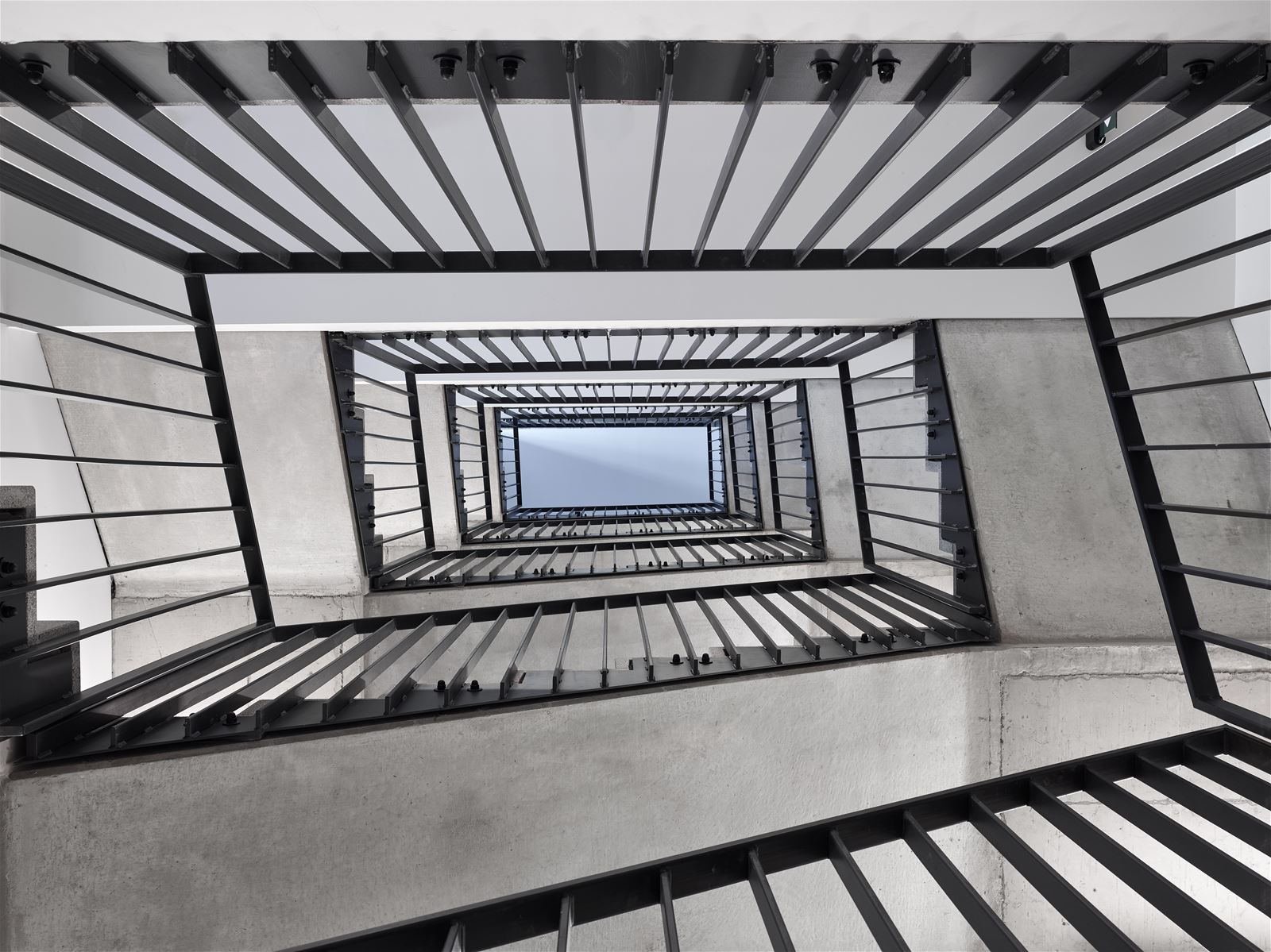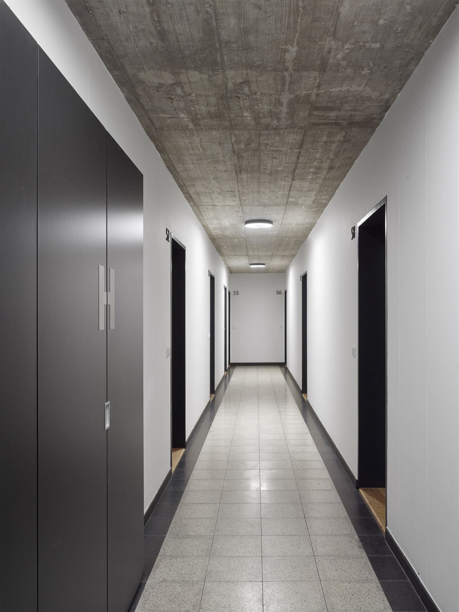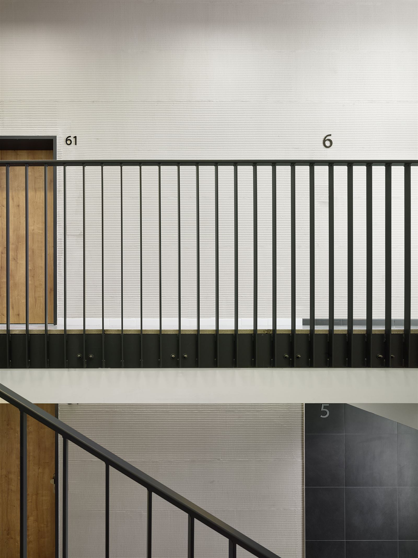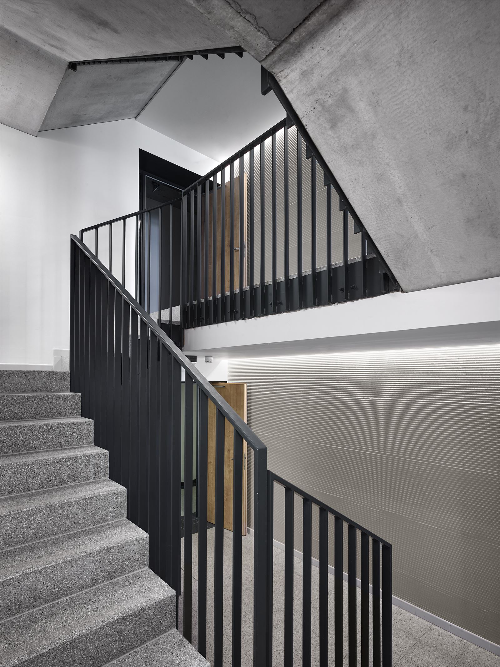 Na stěnách se znovu objevuje drážkovaná omítka. Schodiště je nepřímo osvětlené a vede k bytům různých dispozic, od 1kk až 3kk, po lofty umístěné v nejvyšších patrech. V chodbách je použita terazzová dlažba, stropy jsou ponechány jako pohledový beton.