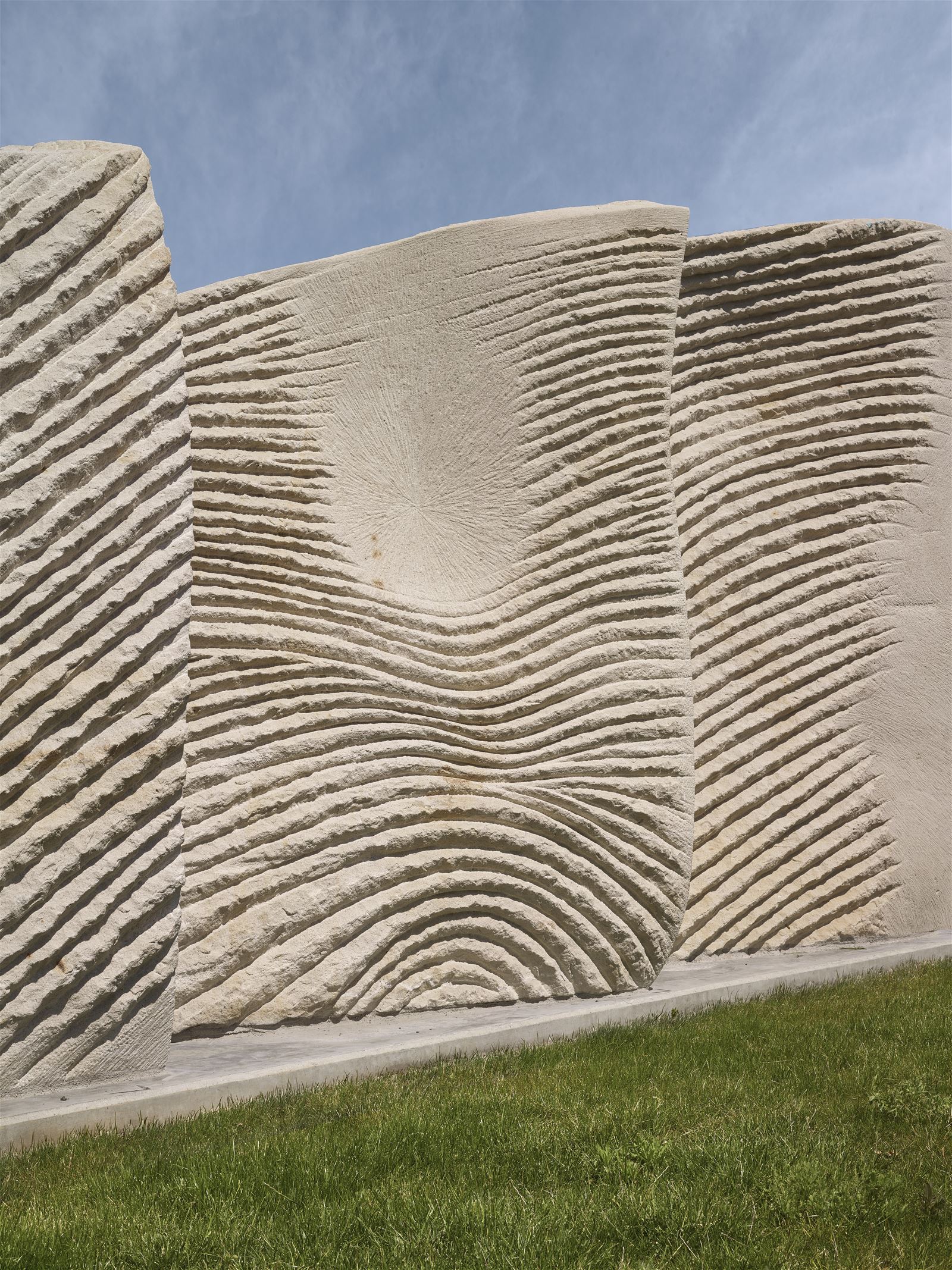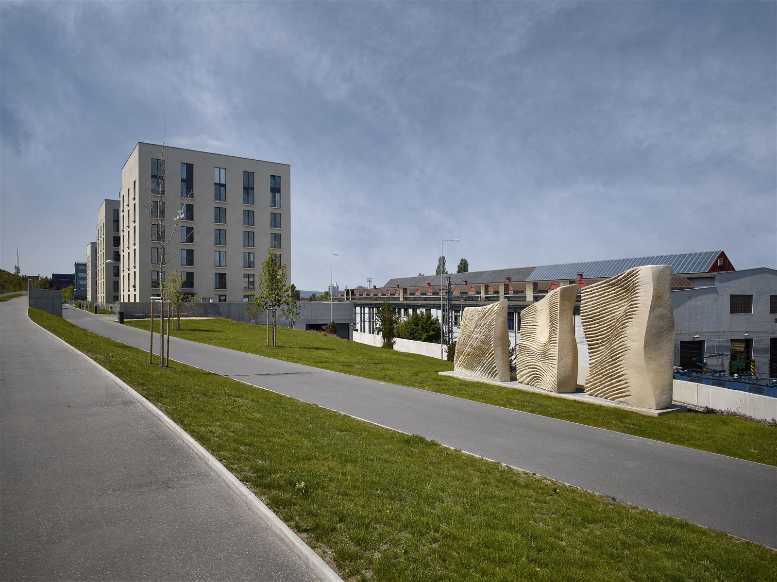 V čele lineárního parku, za kterým je ukryta rampa do podzemních garáží, doplňuje celkovou kompozici pískovcová skulptura na motivy tří ženských postav od sochaře Petra Váni.