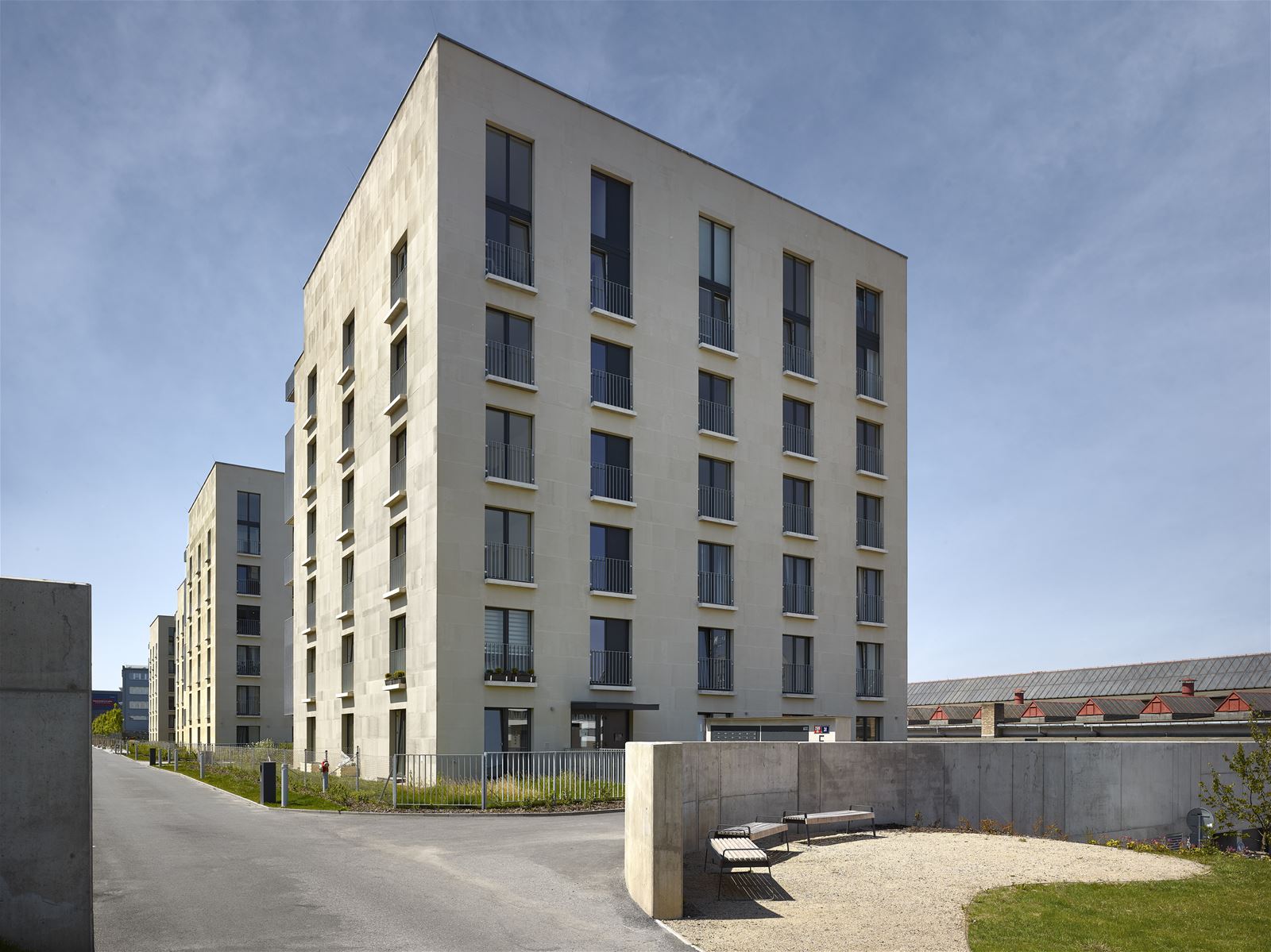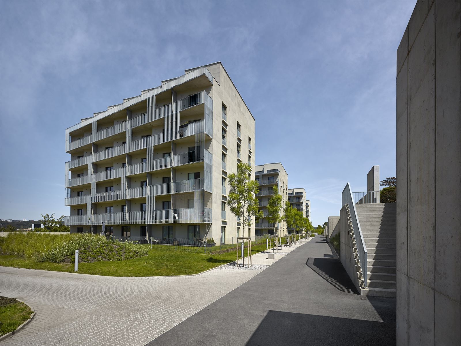 Vůči rušné komunikaci se celý soubor vymezuje průběžnou betonovou zdí. Vzhledem k výškovému rozdílu je zástavba umístěna o úroveň níže, čímž vzniká chráněné veřejné prostranství se zelení.
