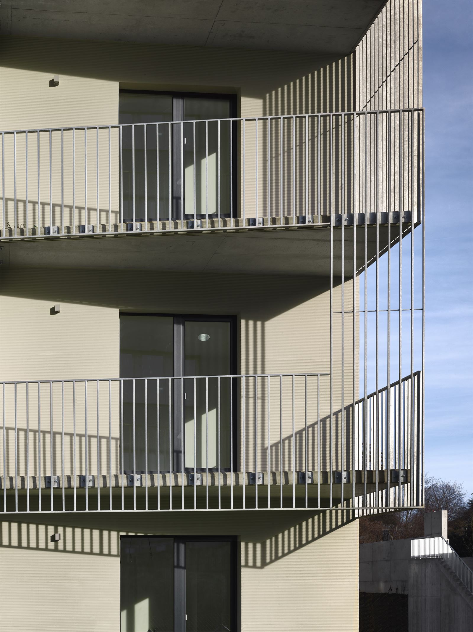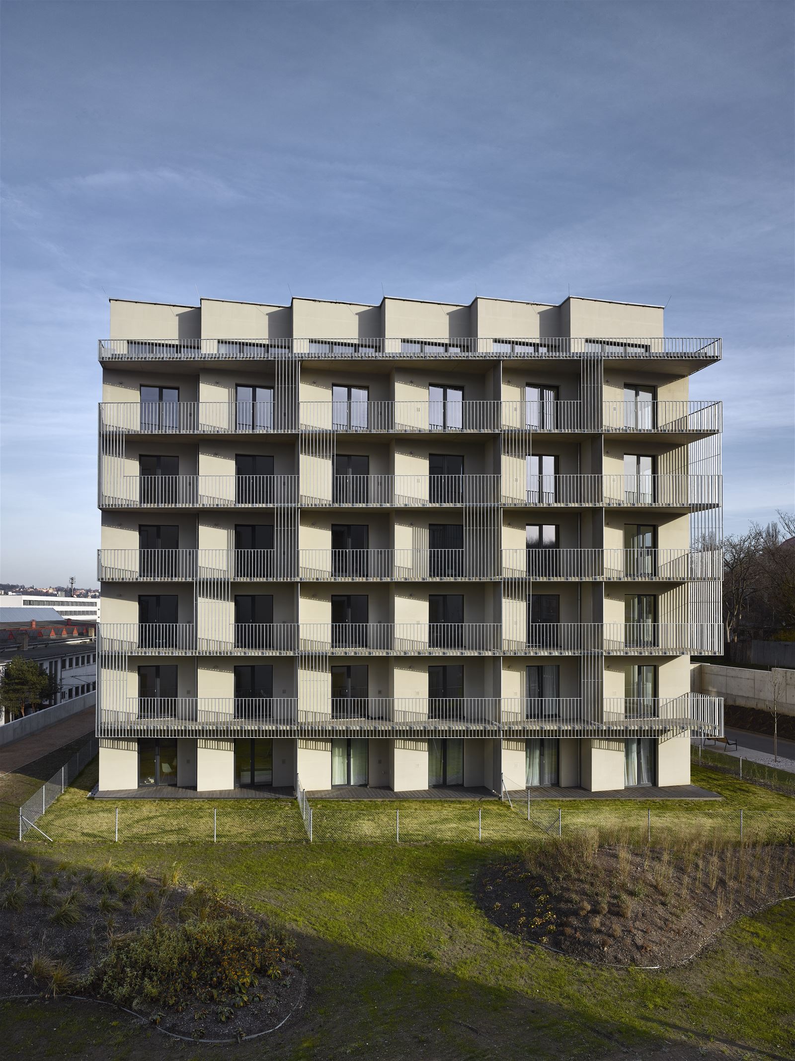 Každý z domů dosahuje výšky pěti plných a jednoho mezonetového podlaží. Jihozápadním fasádám dominuje předsazená ocelová konstrukce s balkony. Zábradlí a dělící stěny tvoří svislé kovové pásy.