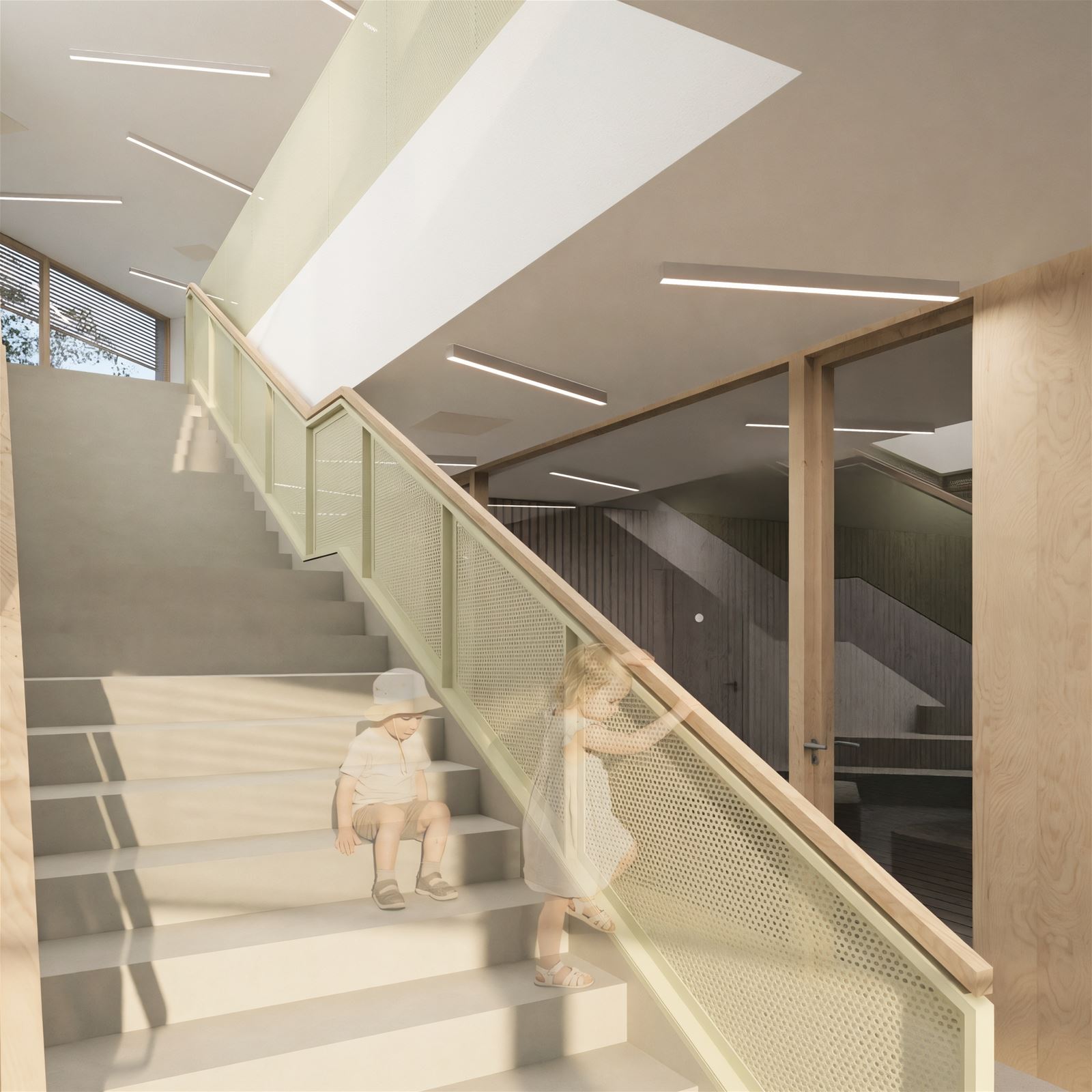 Hlavní vstup, zádveří se závětřím, je v severovýchodním rohu z ulice Trojanova. Z atypické geometrie budovy vychází i centrální komunikační prostor s jednoramenným schodištěm. Součástí je menší administrativní zázemí a gastro provoz s technologiemi. Obslužná část (strojovna, kolárna atd) bude částečně využívána i jako zahradní domeček pro děti se skluzavkou.