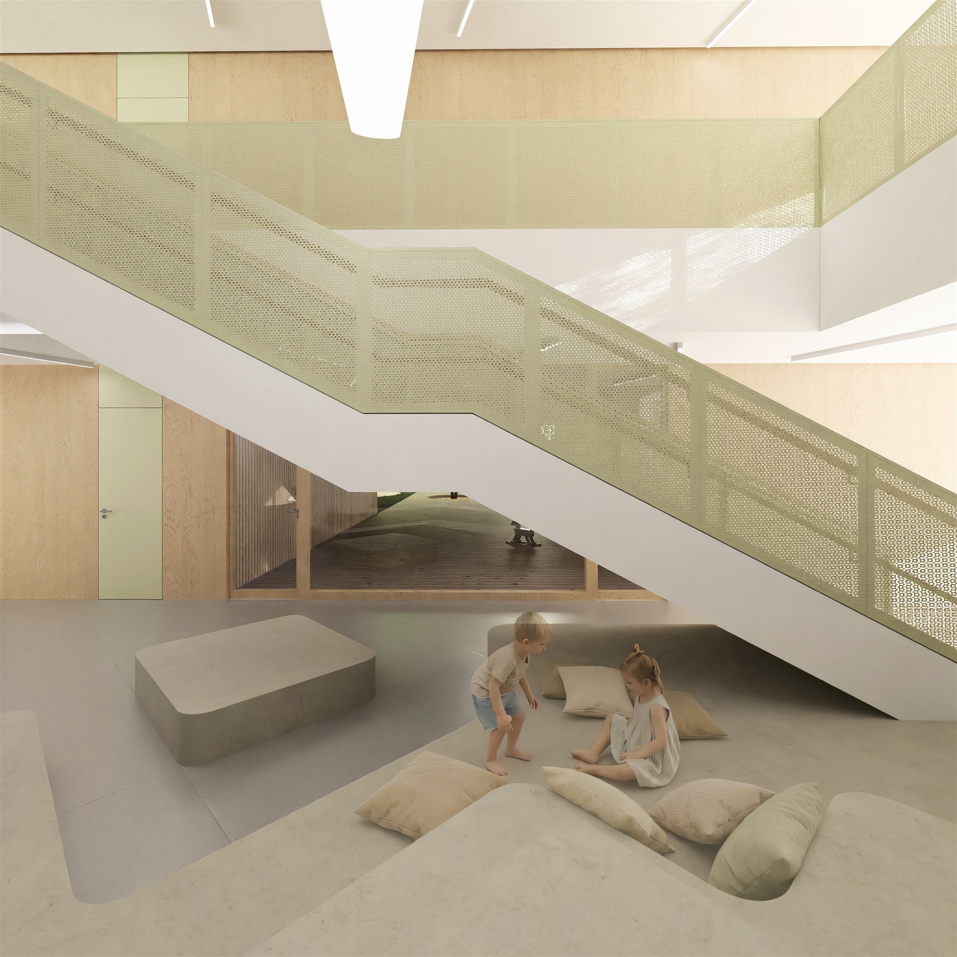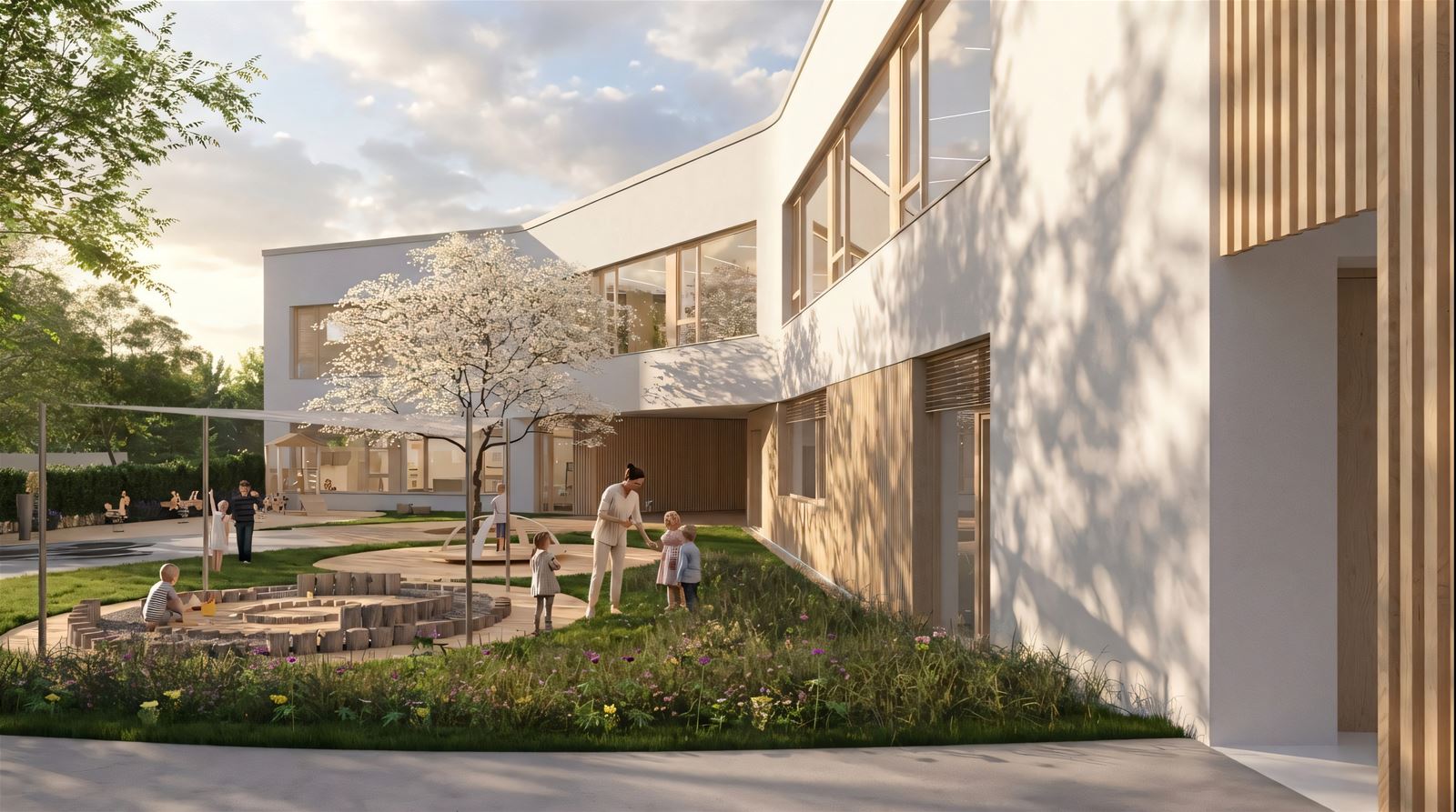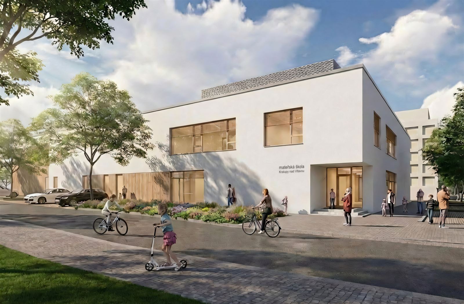 Budova je navržena jako dvoupodlažní a její tvar je komponován jako „otevřená náruč“ s hlavní fasádou tříd orientovanou do zahrady. V přízemí je otevřené průčelí přerušeno a doplněno krytým venkovním prostorem typu salla terrena, který funguje jako přirozený přechod mezi interiérem a zahradou. Vytváří stinné, chráněné místo pro pobyt venku i hru za každého počasí.