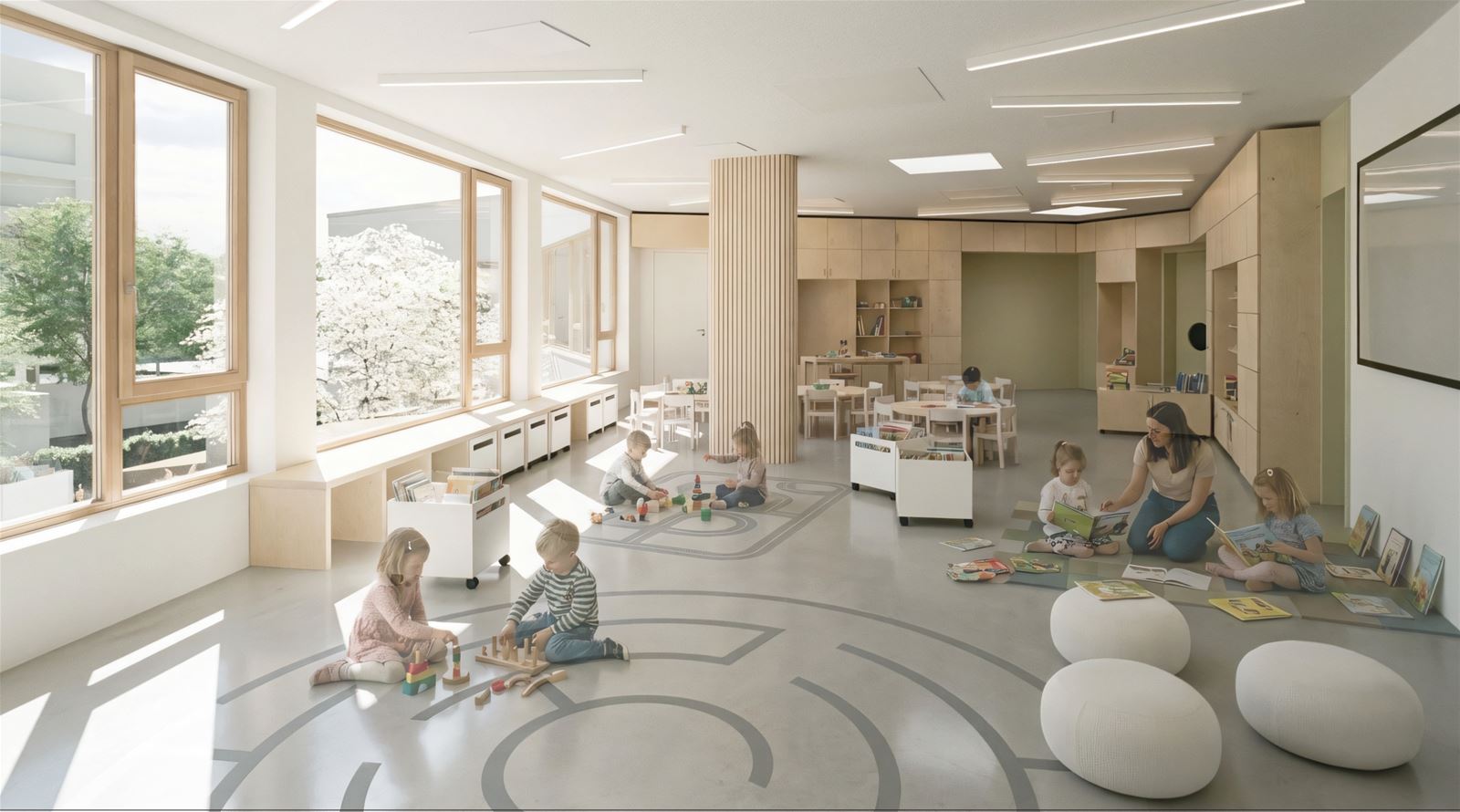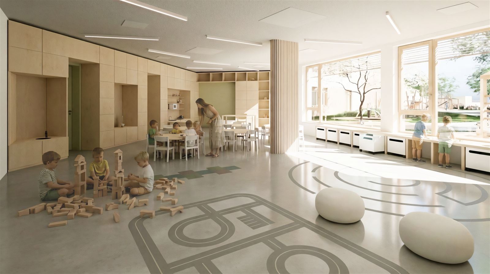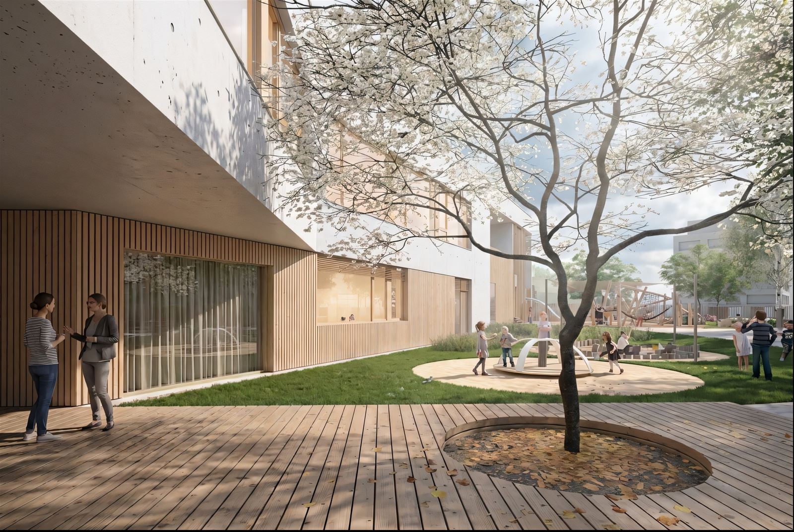 Budova je navržena jako dvoupodlažní a její tvar je komponován jako „otevřená náruč“ s hlavní fasádou tříd orientovanou do zahrady. V přízemí je otevřené průčelí přerušeno a doplněno krytým venkovním prostorem typu salla terrena, který funguje jako přirozený přechod mezi interiérem a zahradou. Vytváří stinné, chráněné místo pro pobyt venku i hru za každého počasí.
