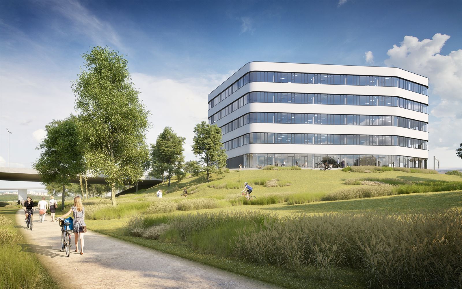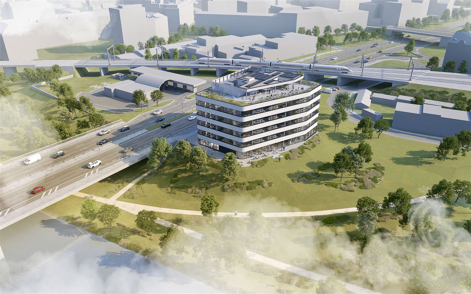 Administrativní budova je situována na předmostí mostu Barikádníků, v místě s mimořádně specifickým urbanistickým kontextem. Zatímco připravovaná Územní studie Holešovice Bubny – Zátory předpokládá pokračování uliční čáry až k samotnému začátku mostní konstrukce, reálné legislativní podmínky, zejména s ohledem na záplavové území, naopak definují objekt spíše jako solitér. Návrh proto hledá rovnováhu mezi oběma přístupy. Formálně je budova pojata jako solitér a vytváří výrazný bod v zeleni. Svou konfigurací však umožňuje budoucí návaznost na řadu dnes nespojitých objektů podél Argentinské ulice. Díky své poloze je dům dobře čitelný jak při příjezdu z mostu, tak z pohledů od řeky.