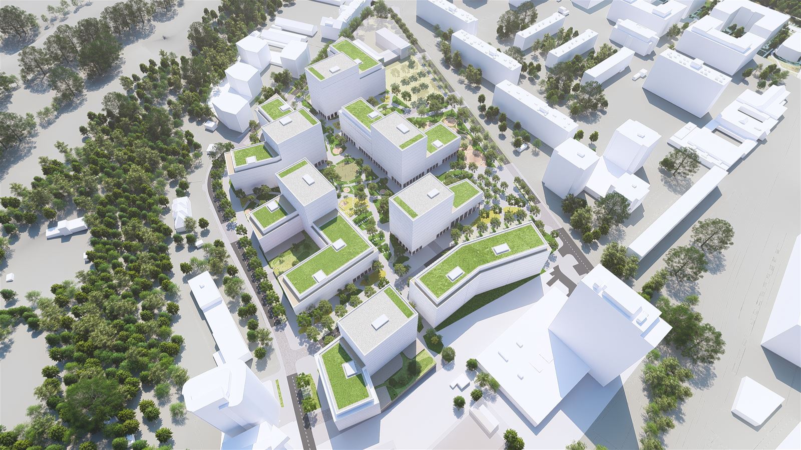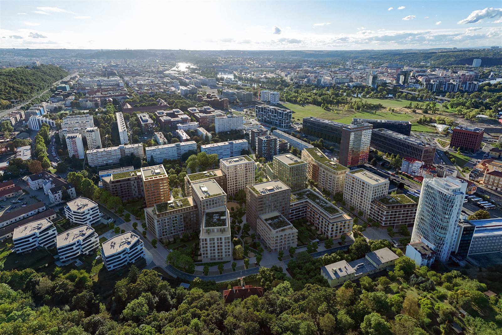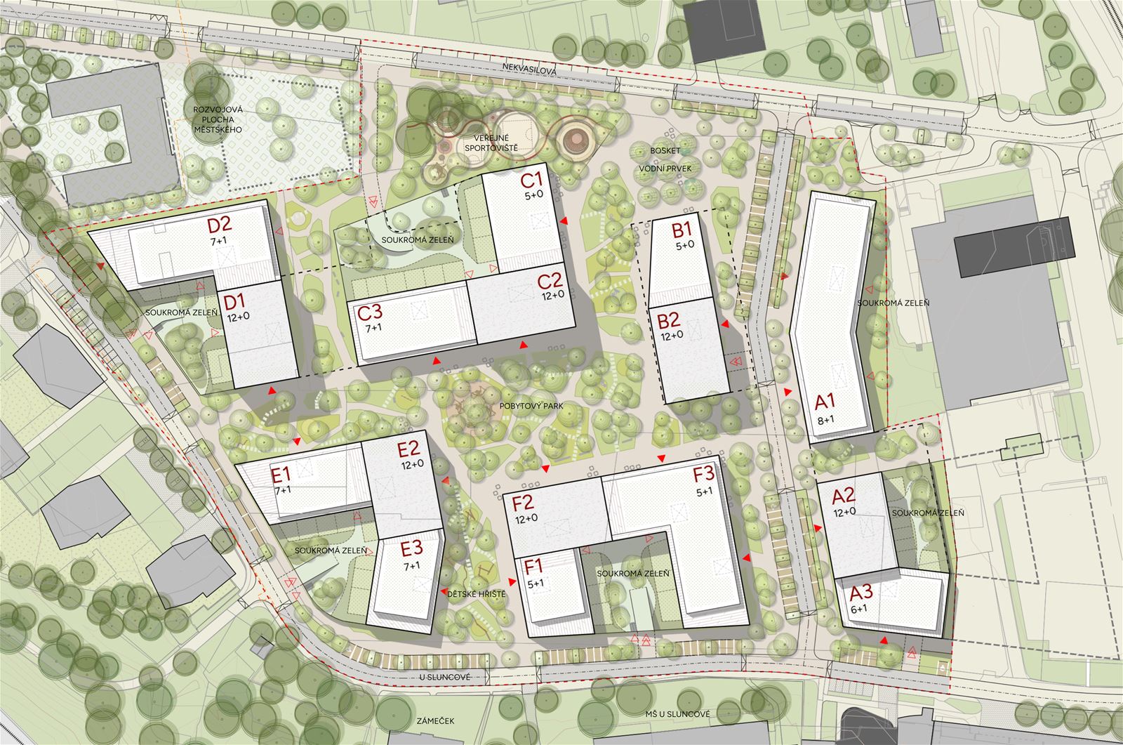 Krajinářský koncept vychází z navržené struktury veřejných prostranství a jejich hierarchie, která určuje principy práce se zelení v celém území. Výsadby i materiálové řešení veřejných prostranství sjednocuje systém zelených ostrovů. Ty se v úrovni chodníku rozprostírají napříč lokalitou, zlepšují mikroklima, podporují vsakování a zadržování dešťové vody v souladu s principy hospodaření s dešťovými vodami a současně vytvářejí pestrou škálu pobytových míst, od vymezených kruhových louček mezi keři s možností sezení až po výraznější stromové celky s trávníky určené k rekreaci. Intimnější zákoutí zpřístupňují šlapáky v trávě a parkové cesty. Návrh klade důraz na přehlednost, prostupnost a přirozenou sociální kontrolu. Formálnější části, jako je vstupní náměstí nebo hlavní ulice, doplňují klasické krajinářské prvky jako jsou aleje a boskety, které prostoru dodávají jasný řád a kompoziční pevnost.