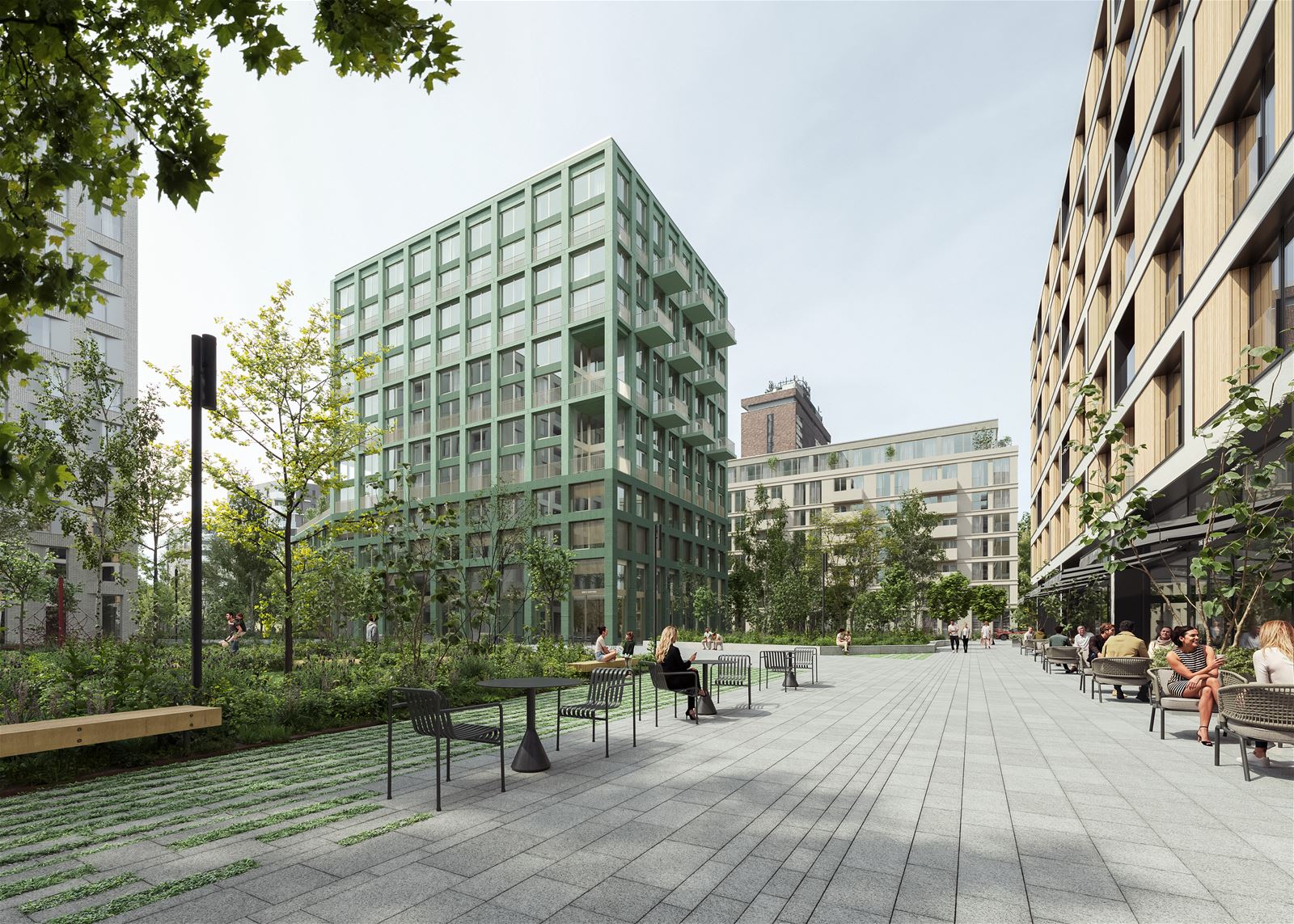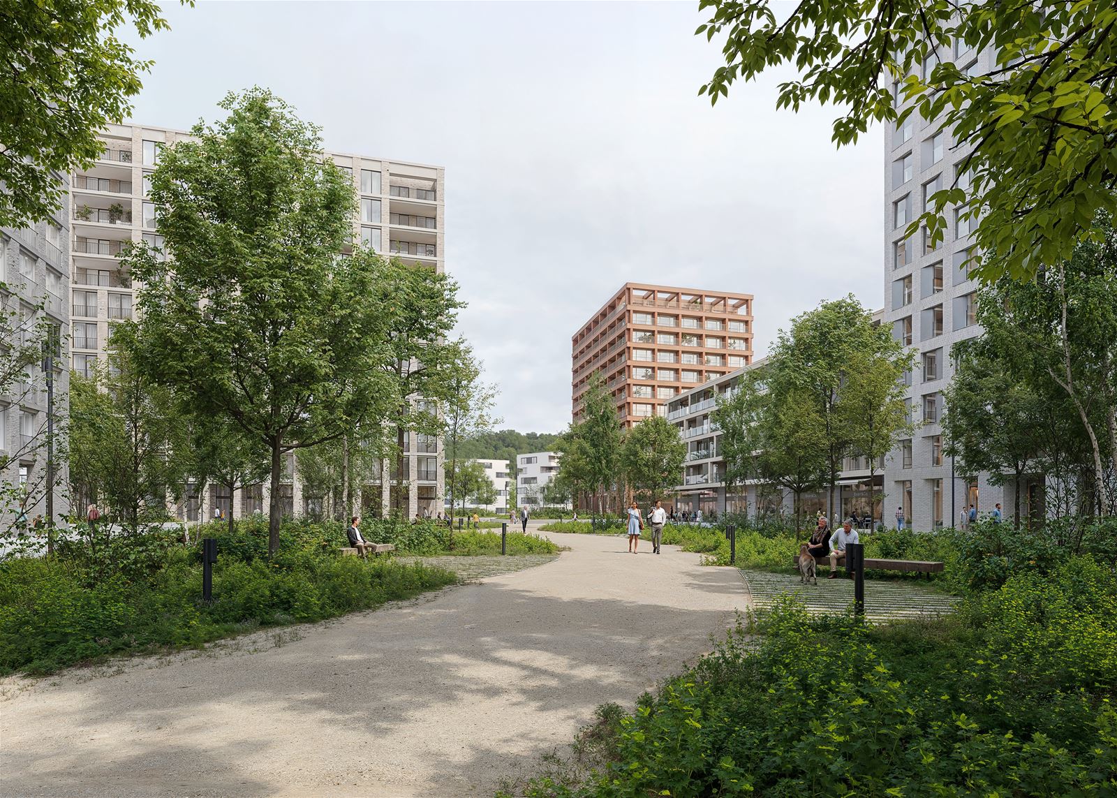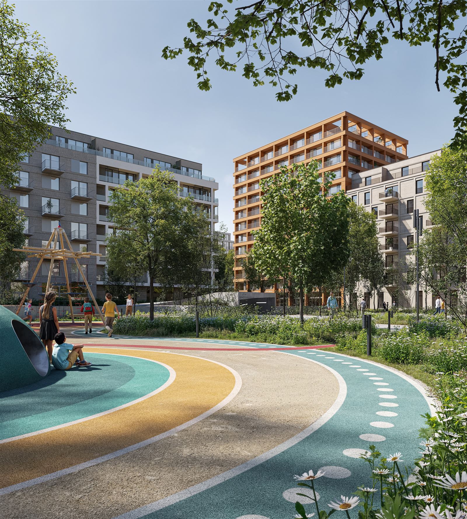 Krajinářský koncept vychází z navržené struktury veřejných prostranství a jejich hierarchie, která určuje principy práce se zelení v celém území. Výsadby i materiálové řešení veřejných prostranství sjednocuje systém zelených ostrovů. Ty se v úrovni chodníku rozprostírají napříč lokalitou, zlepšují mikroklima, podporují vsakování a zadržování dešťové vody v souladu s principy hospodaření s dešťovými vodami a současně vytvářejí pestrou škálu pobytových míst, od vymezených kruhových louček mezi keři s možností sezení až po výraznější stromové celky s trávníky určené k rekreaci. Intimnější zákoutí zpřístupňují šlapáky v trávě a parkové cesty. Návrh klade důraz na přehlednost, prostupnost a přirozenou sociální kontrolu. Formálnější části, jako je vstupní náměstí nebo hlavní ulice, doplňují klasické krajinářské prvky jako jsou aleje a boskety, které prostoru dodávají jasný řád a kompoziční pevnost.