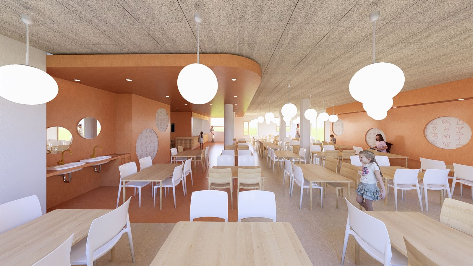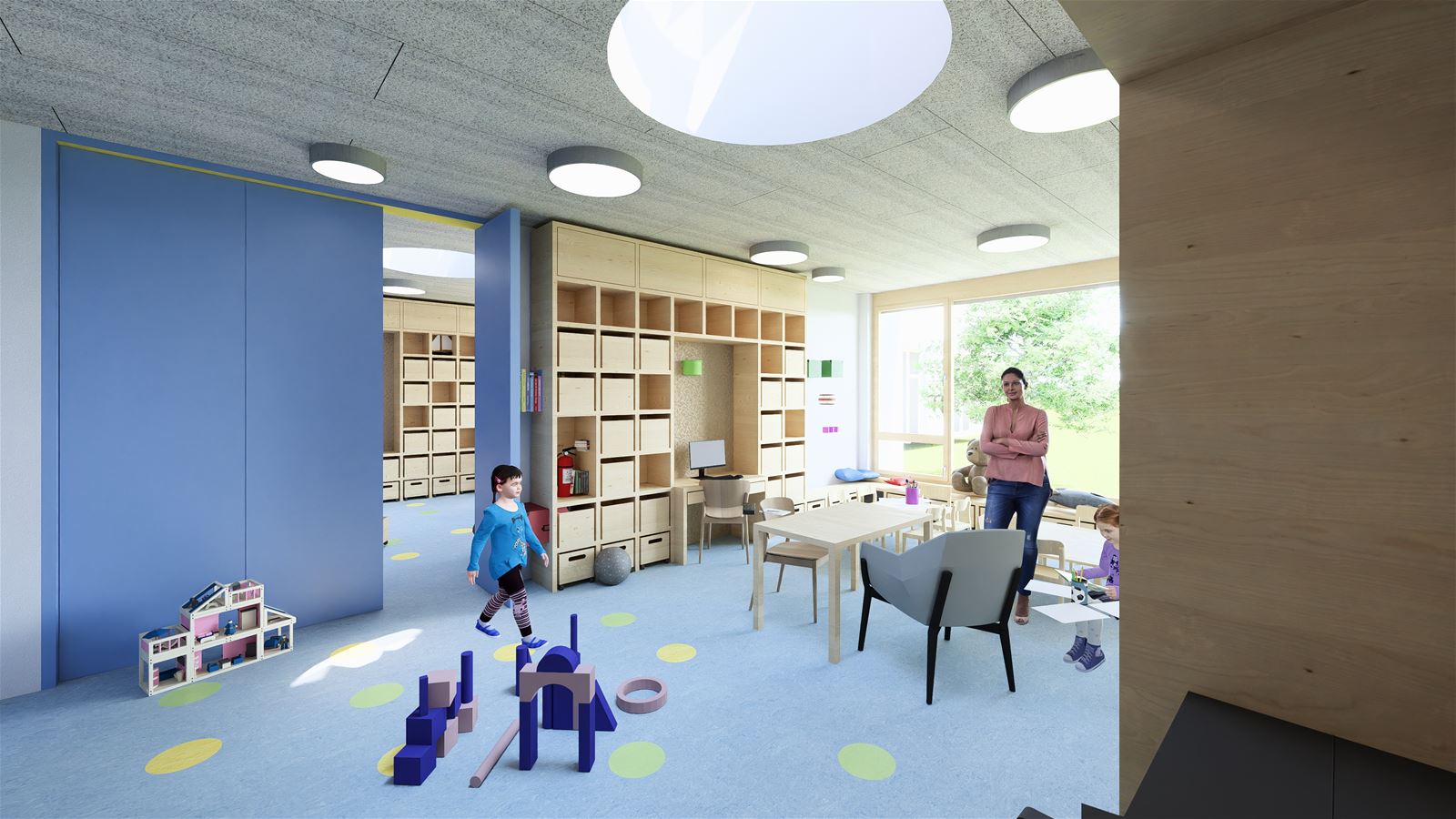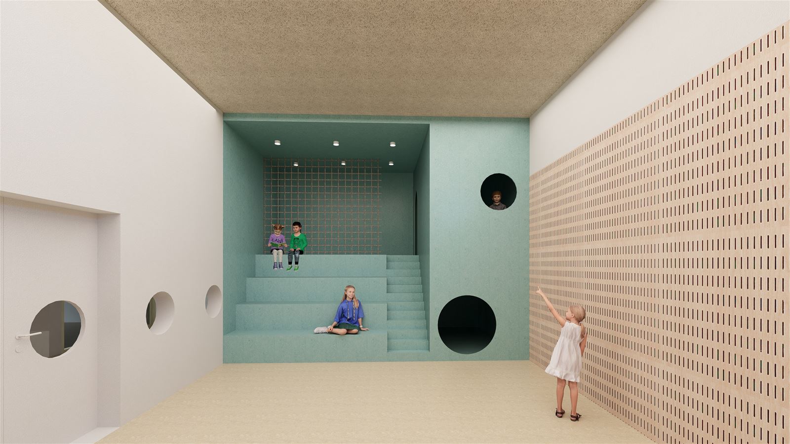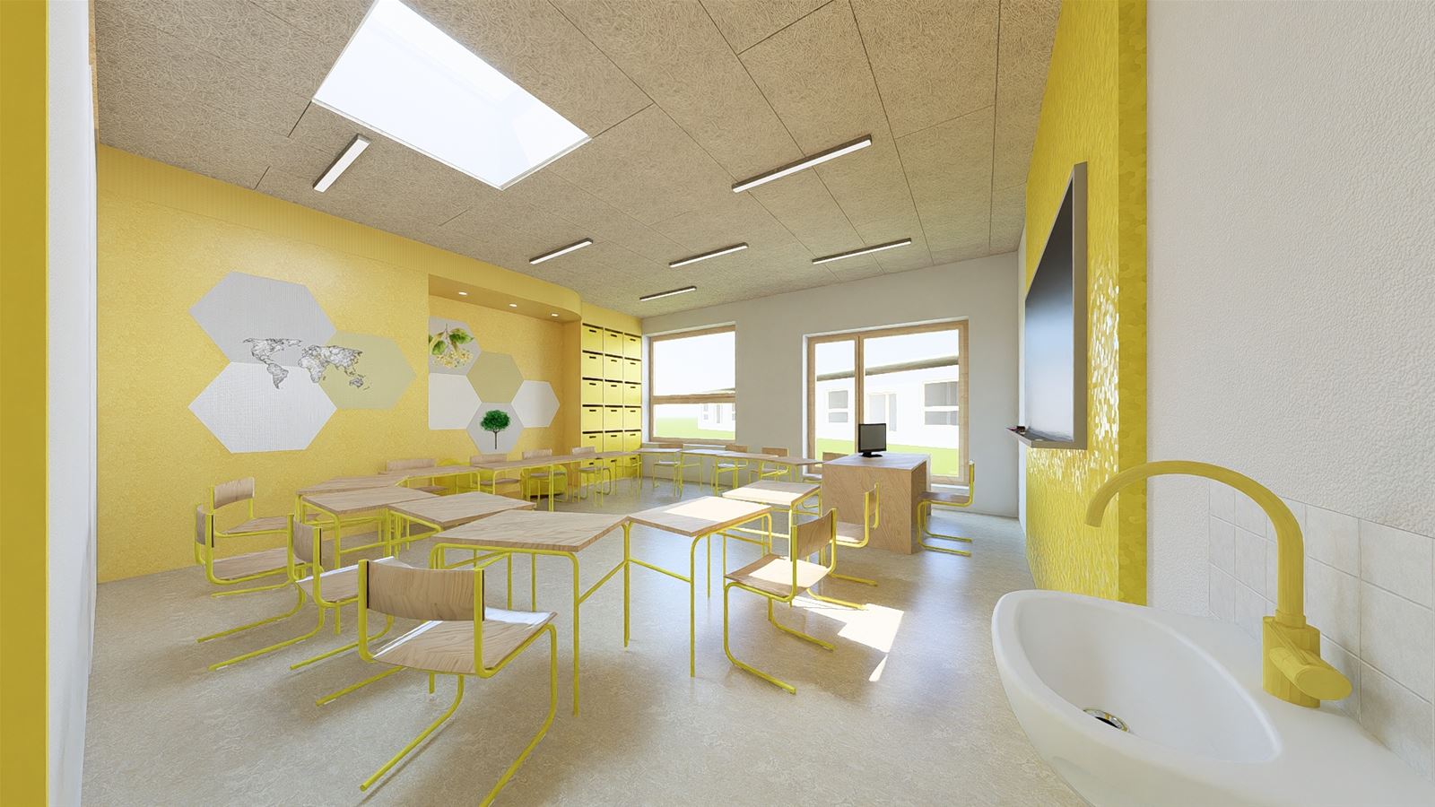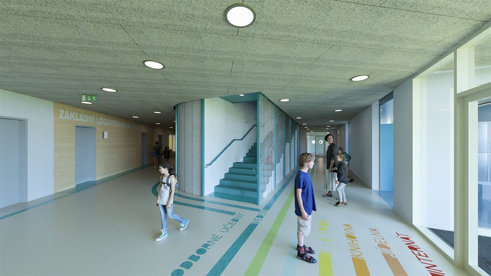 Uvnitř školy vzniká variabilní prostorová struktura, kde obytné chodby plynule přecházejí do tříd, relaxačních zón i terapeutických koutů. A právě speciální logopedická pracoviště, herny a učebny jsou zásadními prvky, které dělají z areálu nejen školu, ale i prostředí intenzivní pedagogické a terapeutické podpory. Každý detail vychází vstříc dětem a jejich potřebám. Prostor podporuje přirozenou komunikaci skrze světlo, tvary a barvy. Respektuje střídání soustředění a odpočinku.